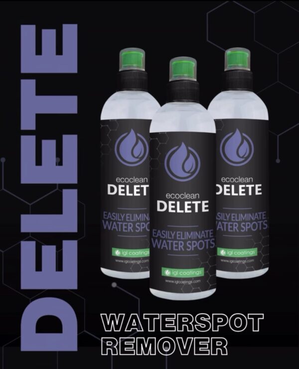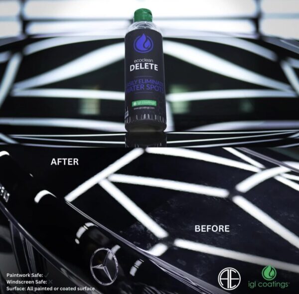 Ecoclean delete, yüzeyde asit yağmuru veya musluk suyu gibi suyun bıraktığı sert mineralleri yumuşatan güçlü bir asidik karışımı olan nanoteknolojiye dayanan özel olarak formüle edilmiş bir temizleyicidir. Bu mineraller artık aşındırıcıya gerek kalmadan çıkarılabilir. Aynı zamanda etkili bir yol tuzu gidericisidir. Tüm Boyalı Yüzeylerde Kullanılabilir.Kullanımı Kolay Boyalı yüzeye Damlatın Ve Bezle Silin. cam yüzeylerde kullanılabilir, yüzey sıcak olmamalıdır. ürün cam yüzeye el pedi yada bez yardımı ile uygulanır sonrasında bol su ile durulanmalıdır.